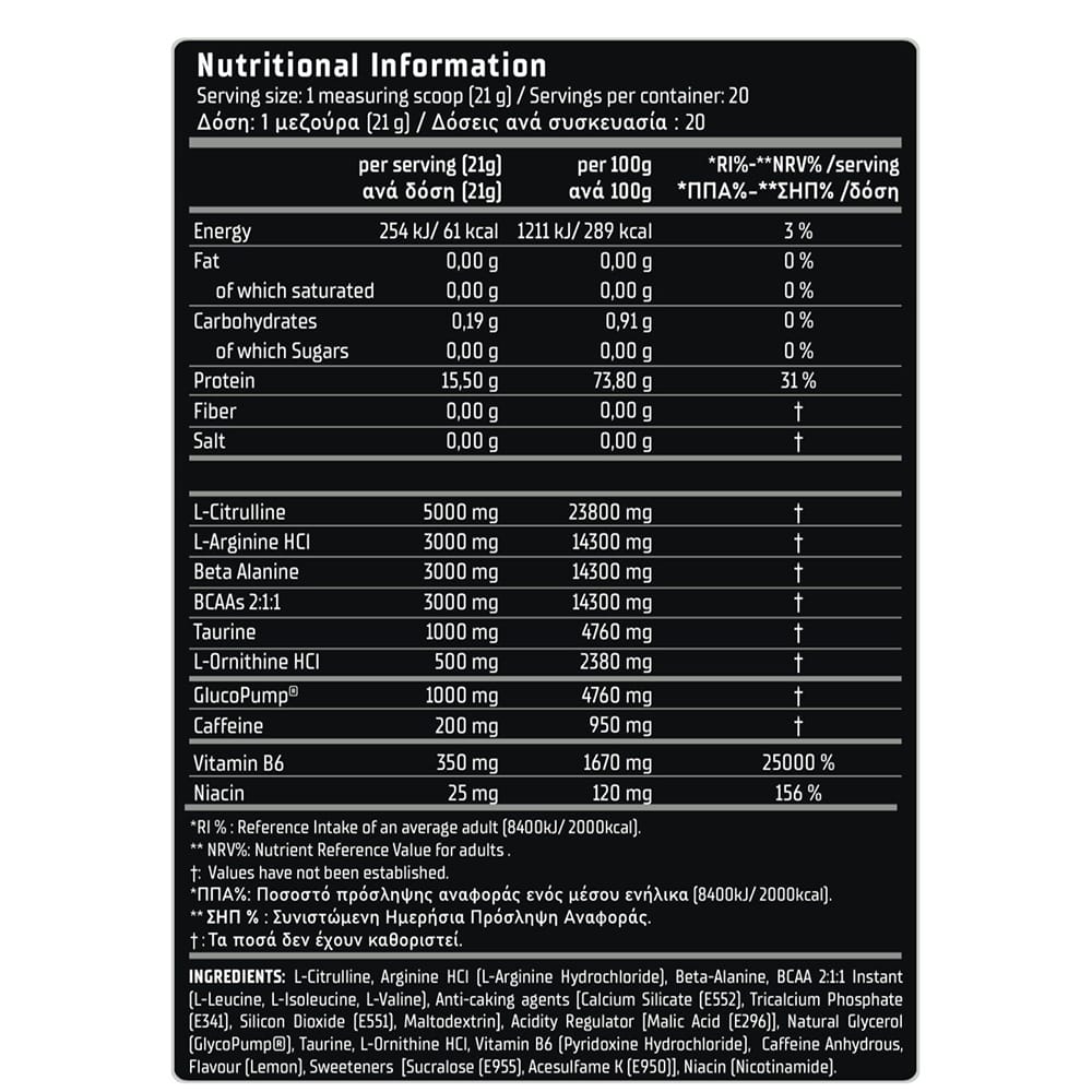Με μια τεράστια δόση 6000mg Μηλικής Κιτρουλίνης και 2000mg Αργινίνης AKG, προσφέρει ασύλληπτη αιμάτωση, αγγειοδιαστολή και μεταφορά θρεπτικών συστατικών στους μύες.