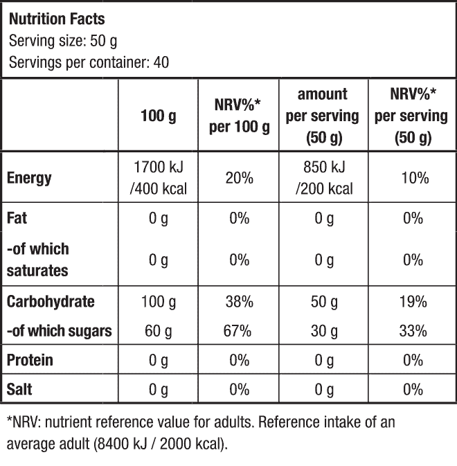 - 💧 Ισομαλτουλόζη (Palatinose™): χαμηλότερη αύξηση σακχάρου σε σχέση με τα απλά σάκχαρα.