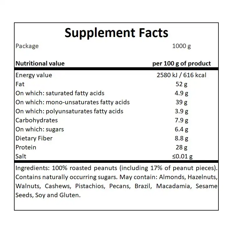 Συστατικά: 100% ψημένα φιστίκια (peanuts). Καμία προσθήκη ζάχαρης, αλατιού ή φοινικέλαιου.