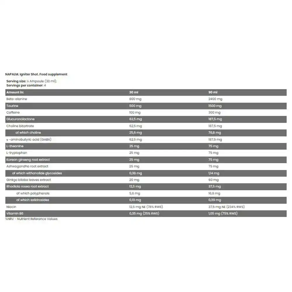 Η σύνθεση του Xtreme Napalm® Igniter Shot περιλαμβάνει αμινοξέα όπως