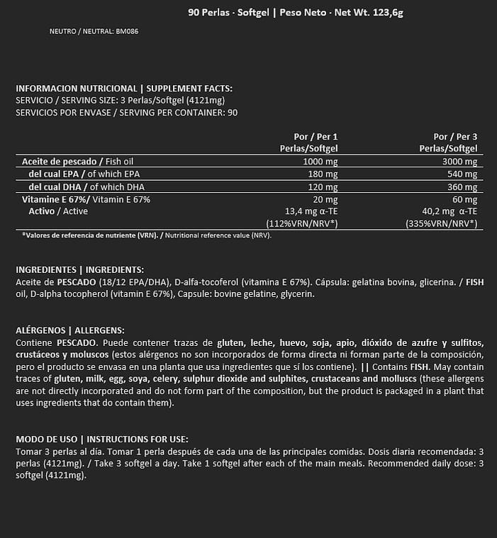 Το Fish Oil Omega 3 της Big Man Nutrition είναι ένα συμπλήρωμα υψηλής καθαρότητας που προσφέρει βέλτιστη αναλογία EPA και DHA — τα δύο πιο σημαντικά ωμέγα-3 λιπαρά οξέα — μαζί με Βιταμίνη E για ισχυρή αντιοξειδωτική προστασία.