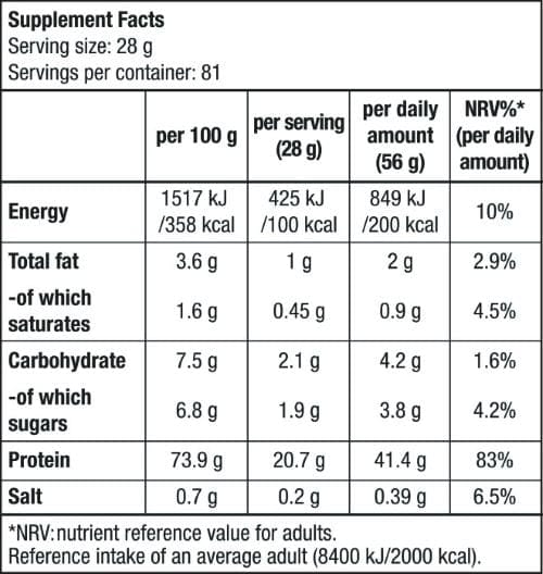 Καθαρή πρωτεΐνη (20.7g/δόση) με ελάχιστα λιπαρά (1g) και υδατάνθρακες (2.1g). Η απόλυτη επιλογή για lean bulk (καθαρό όγκο) ή γράμμωση, αποδίδοντας μόλις 100 θερμίδες.